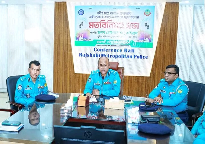 পবিত্র মাহে রমজান উপলক্ষ্যে রাজশাহী মহানগরীতে আইনশৃঙ্খলা পরিস্থিতি এবং নিত্যপণ্যের মূল্য সংক্রান্ত মতবিনিময় সভা অনুষ্ঠিত হয়েছে।