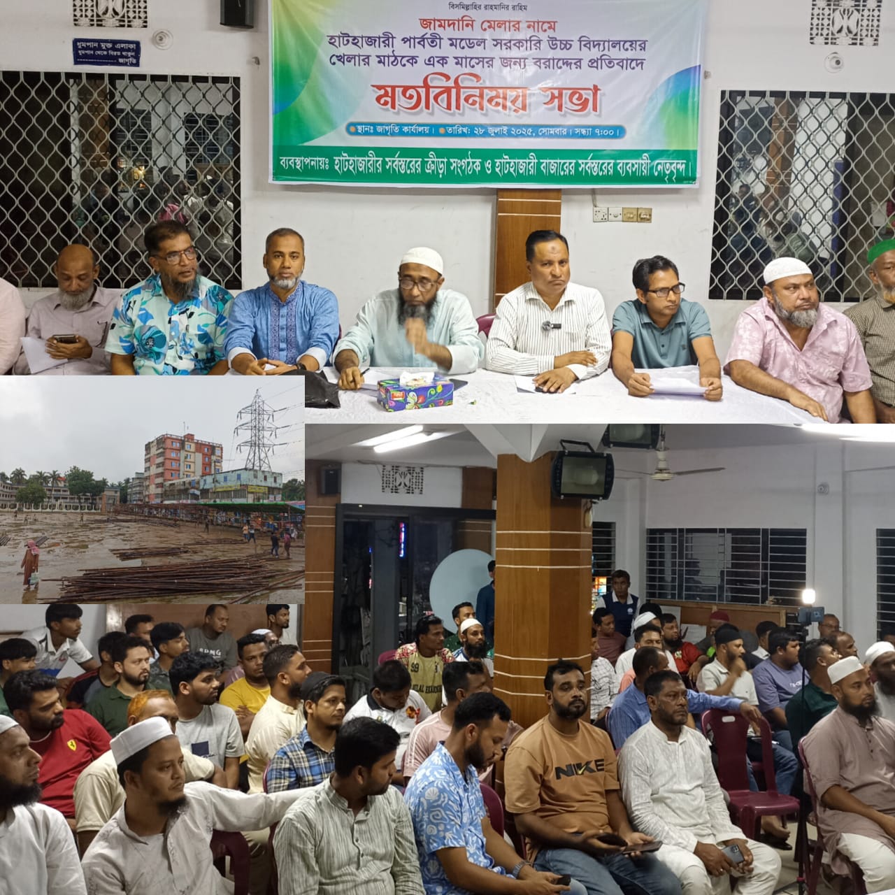 আজ রবিবার ২৮ জুলাই সন্ধ্যায় জাগৃতি কার্যালয়ে স্থানীয় খেলোয়াড় এবং হাটহাজারী বাজার ব্যবসায়ীদের এক যৌথ সভা অনুষ্ঠিত হয়। হাটহাজারী পৌরসভা ব্যবসায়ী সমিতির আহ্বায়ক আব্দুর শুক্কুর এর সভাপতিত্বে এবং এবং হাটহাজারী ক্রীড়া সংস্থার সাবেক সাধারণ সম্পাদক আছলাম মোর্শেদের পরিচালনায় মতবিনিময় আগামীকাল ২:৩০ এ নির্বাহী অফিসের মাধ্যমে জেলা প্রশাসক কে স্মারকলিপি প্রদানের সিদ্ধান্ত গৃহীত হয়।