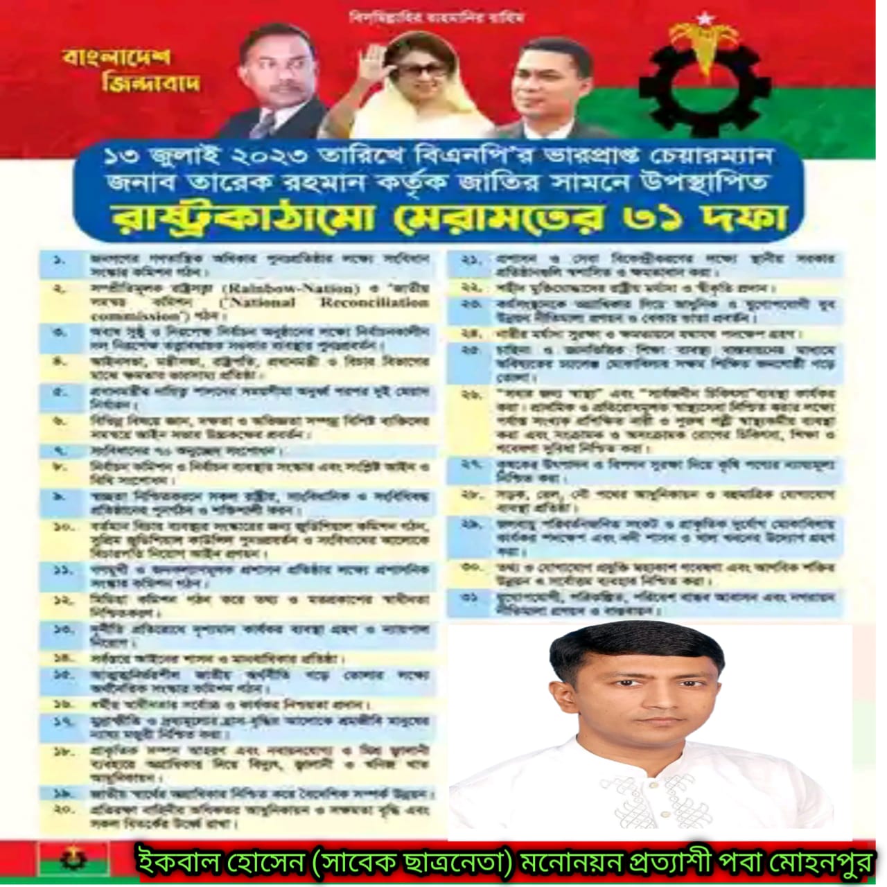 বাংলাদেশ জাতীয়তাবাদী দল (বিএনপি) ঘোষিত ৩১ দফা রূপরেখা বাস্তবায়নের অংশ হিসেবে রাজশাহী পবা মোহনপুর উপজেলায় গণসংযোগ কার্যক্রমের মাধ্যমে লিফলেট বিতরণ করা হয়েছে। ২০ সেপ্টেম্বর রোজ শনিবার বিকেলে রাজশাহী পবা হরিয়ান ইউনিয়নের হায়াত মোড়ে লিফলেট বিতরণ করেন বাংলাদেশ জাতীয়তাবাদী দল। রাজশাহী জেলা বিএনপির সাবেক সাবেক ছাত্রনেতা ইকবাল হোসেন কর্মসূচিতে বিএনপি এবং সহযোগী সংগঠনের নেতাকর্মীরা সক্রিয় অংশগ্রহণ করেন। বাংলাদেশ জাতীয়তাবাদী দল বিএনপি ৩১ দফা বাস্তবায়নের লক্ষ্যে রাজশাহী। দেশে জনগণের ভোটাধিকার পুনঃপ্রতিষ্ঠা, গণতন্ত্র ও সুশাসন নিশ্চিত করার লক্ষ্যে বিএনপির ৩১ দফা কর্মসূচি অত্যন্ত সময়োপযোগী। তারা বলেন, সাধারণ মানুষের মাঝে সচেতনতা সৃষ্টির জন্য লিফলেট বিতরণের মাধ্যমে তারা চলমান আন্দোলনে সবাইকে সম্পৃক্ত হওয়ার আহ্বান জানাচ্ছে, বাংলাদেশ জাতীয়তাবাদী দল বিএনপি ৩১ দফা বাস্তবায়নের লক্ষ্যে রাজশাহী জেলা শাখার সম্মানিত আহ্বায়ক গোলাম জাকারিয়া সহ আরোও উপস্থিত ছিলেন পৌর বিএনপির সাধারণ সম্পাদক এইচ এম এম জামাল বাচ্চু হরি পুর ইউনিয়নের সাধারণ সম্পাদক জামিরুল ইসলাম, রাজশাহী জেলা শাখার যুগ্ন আহবায়ক ইবনে হাবিব আল মারুফ পৌর বিএনপির সহ সভাপতি কামরুজ্জামান মুক্তা,পৌর বিএনপির সাবেক যুগ্ন আহ্বায়ক আব্দুল কামাল, জেলা বিএনপির সদস্য আব্দুস সালাম , চলচ্চিত্র পরিচালক জাতীয় পুরস্কারপ্রাপ্ত ওয়াহেদুজ্জামান ডায়মন্ড সহ অঙ্গসংগঠনের নেতৃবৃন্দ