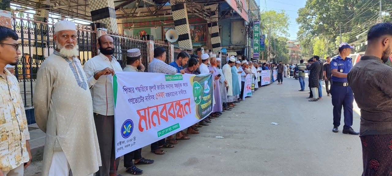 বুধবার ১৫ অক্টোবর২০২৫, সকালে বান্দরবান প্রেসক্লাবের সামনে আয়োজিত মানববন্ধনে জেলা জামায়াতের আমীর এইচ এম আব্দুচ ছালাম আজাদের নেতৃত্বে ,এতে নায়েবে আমীর ও বান্দরবান ৩০০নং সংসদ সদস্য প্রার্থী এডভোকেট আবুল কালাম, সেক্রেটারি মাওলানা আব্দুল আউয়াল প্রমুখ উপস্থিত থেকে বক্তব্য রাখেন।