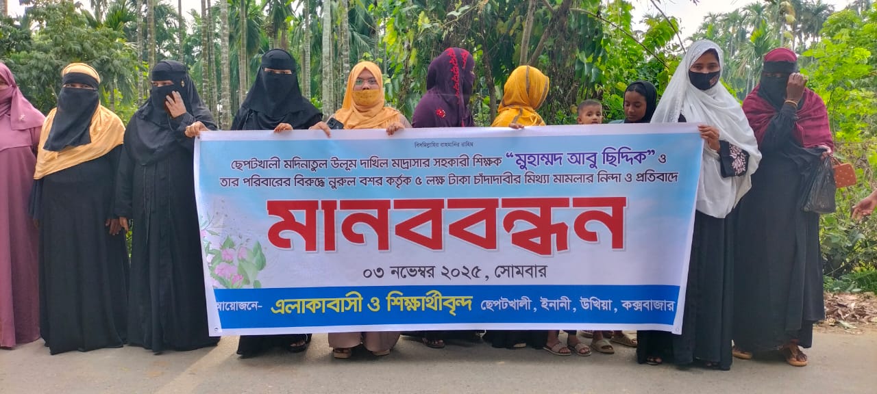 কক্সবাজারের উখিয়া উপজেলার জালিয়া পালং ইউনিয়নের ৮ নং ওয়ার্ডের ছেপটখালী ঢালার মুখ এলাকায় মিথ্যা মামলা প্রত্যাহার চেয়ে মানববন্ধন করেছে গ্রামের শতাধিক মানুষ।গত ৩ নভেম্বর সোমবার দুপুর ২টা দিকে ছেপটখালী ঢালার মুখে এই মানববন্ধন করেন এলাকাবাসী।