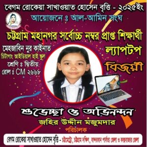 আল-আমিন সংঘের আয়োজনে অনুষ্ঠিত এই সম্মানজনক বৃত্তি পরীক্ষায় চট্টগ্রাম মেট্রো,চট্টগ্রাম দক্ষিণ,বান্দরবান পার্বত্য জেলা ও কক্সবাজার জেলার অসংখ্য শিক্ষার্থী অংশগ্রহণ করে,বাংলা, ইংরেজি, গণিত, সাধারণ জ্ঞান এবং নারী জাগরণের অগ্রদূত বেগম রোকেয়া সাখাওয়াত হোসেনের জীবনী ও কর্ম—এই ভিন্ন বিষয়ে শিক্ষার্থীদের মেধা যাচাই করা হয়,প্রতিটি বিষয়েই অসাধারণ দক্ষতা দেখিয়ে মেহজাবিন সেরাদের সেরা হওয়ার গৌরব অর্জন করেছে,