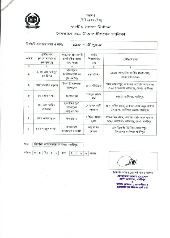গাজীপুর-৫ কালীগঞ্জ আসনে ৬ প্রার্থীর মনোনয়নপত্র বৈধ ও ২ প্রার্থীর বাতিল