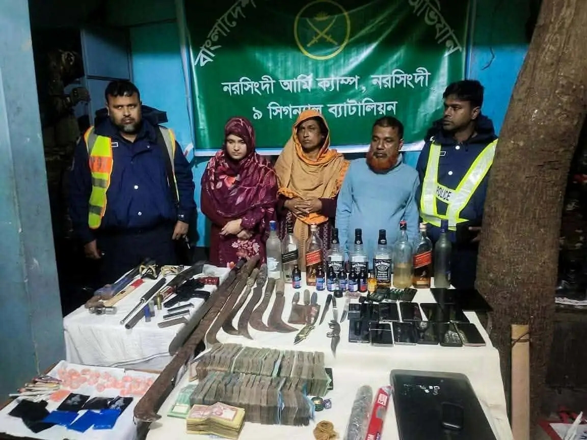 যৌথবাহিনীর অভিযানে বিপুল পরিমাণ অস্ত্র,মাদক ও নগদ অর্থ সহ নরসিংদীর শিবপুরে সাত জনকে গ্রেফতার ।