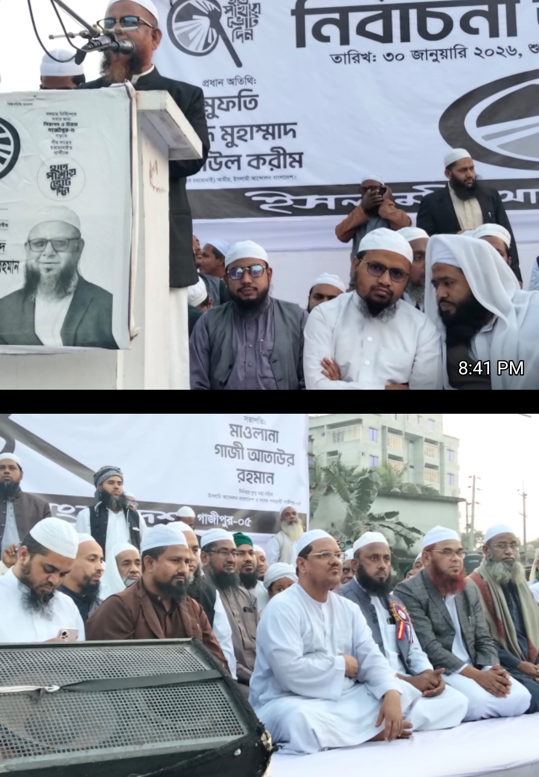 শুক্রবার (৩০ জানুয়ারী) বিকাল ৪ ঘঠিকার সময় কালীগঞ্জের জামালপুর ইউনিয়নের জামালপুর আর এম বিদ্যাপীঠ উচ্চ বিদ্যালয় মাঠে নির্বাচনী জনসভায় প্রধান অতিথি মুফতি সৈয়দ মুহাম্মদ রেজাউল করীম আরো বলেন, ইসলামী আদর্শ অনুযায়ী দেশকে ভালবাসা সকলের কর্তব্য। দেশের একটি বিরাট অংশ তরুণ প্রজন্ম। তাদেরকে দেশের উন্নয়নে ইসলামের ছায়াতলে থেকে কাজ করতে হবে। ভাল নেতৃত্ব ছাড়া জাতির মুক্তি নেই। গাজীপুরের মাটি ইসলামের ঘাটি। আগামী ১২ ফেব্রুয়ারী ত্রয়োদশ জাতীয় সংসদ নির্বাচনে মাওলানা গাজী আতাউর রহমানকে হাতপাখায় ভোট দিয়ে বিজয়ী করতে তিনি সকলে প্রতি আহবান জানান।