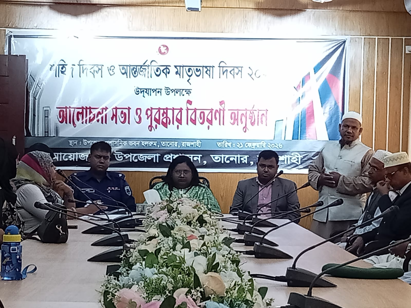 রাজশাহীর তানোর উপজেলা প্রশাসনের আয়োজনে আজ ২১ শে ফেব্রুয়ারি মহান শহীদ দিবস ও আন্তর্জাতিক মাতৃভাষা দিবসের আলোচনা সভা এবং বিজয়ী শিক্ষার্থীদের মাঝে পুরস্কার বিতরণ অনুষ্ঠিত হয়েছে। আজ তানোর উপজেলা প্রশাসন হল রুমে সকাল দশ ঘটিকার সময় উপজেলা নির্বাহী অফিসার জনাব নাঈমা খানের সভাপতিত্বে শুরুতে পবিত্র কুরআন তেলায়তের মাধ্যমে মহান শহিদ দিবসের তাৎপর্য পূর্ণ আলোচনা শুরু হয়। শহিদ দিবসের শুরুতে ছোট্ট শিশু শিক্ষার্থী মহান শহিদ দিবসের তাৎপর্য পূর্ণ চমৎকার আলোচনা করেন। এরপর তানোর উপজেলার বীর মুক্তিযোদ্ধাগণ, শিক্ষক গণ, বাংলাদেশ জামায়াতে ইসলামীর তানোর উপজেলার আমির আলমগীর হোসেন, তানোর উপজেলা স্বাস্থ্য কমপ্লেক্স ও পরিবার পরিকল্পনা কর্মকর্তা প্রধান ডা: বার্নাবাস হাসদা, তানোর থানার অফিসার ইনচার্জ মো: শাহিনুজ্জামান। সর্বশেষ সভাপতি উপজেলা নির্বাহী অফিসার আলোচনা করেন। সকল বক্তাগণ নানা দিক নির্দেশনা মূলক ২১শে ফেব্রুয়ারি মহান শহীদ দিবস ও আন্তর্জাতিক মাতৃভাষা দিবসের তাৎপর্য ও গুরুত্ব আলোচনা করেন। সকলেই বাংলা ভাষাকে বুকে ধারণ করে যে কোন বিপদ মূহুর্তে জীবন দিয়ে হলেও বাংলাদেশ কে রক্ষা করার দৃঢ় প্রত্যয় ব্যক্ত করেন। আলোচনা সভায় উপজেলা প্রশাসনের সকল কর্মকর্তা গণ, বীর মুক্তিযোদ্ধা গণ, শিক্ষক গণ, জামায়াতে ইসলামীর নেতা কর্মী গণ এবং শিক্ষার্থী গণ এবং অভিভাবক গণ উপস্থিত ছিলেন। আলোচনার শেষের দিকে সভাপতি উপজেলা নির্বাহী অফিসার জনাব নাঈমা খান অতি গুরুত্বপূর্ণ আলোচনা করেন। আলোচনা শেষে বিজয়ী শিক্ষার্থীদের হাতে উপজেলা নির্বাহী অফিসার ও অন্যান্য অফিসারের সমন্বয়ে পুরস্কার তুলে দেওয়া হয়। পুরস্কার বিতরণ শেষে সুশৃঙ্খলভাবে সভার সমাপ্তি ঘোষণা করা হয়।