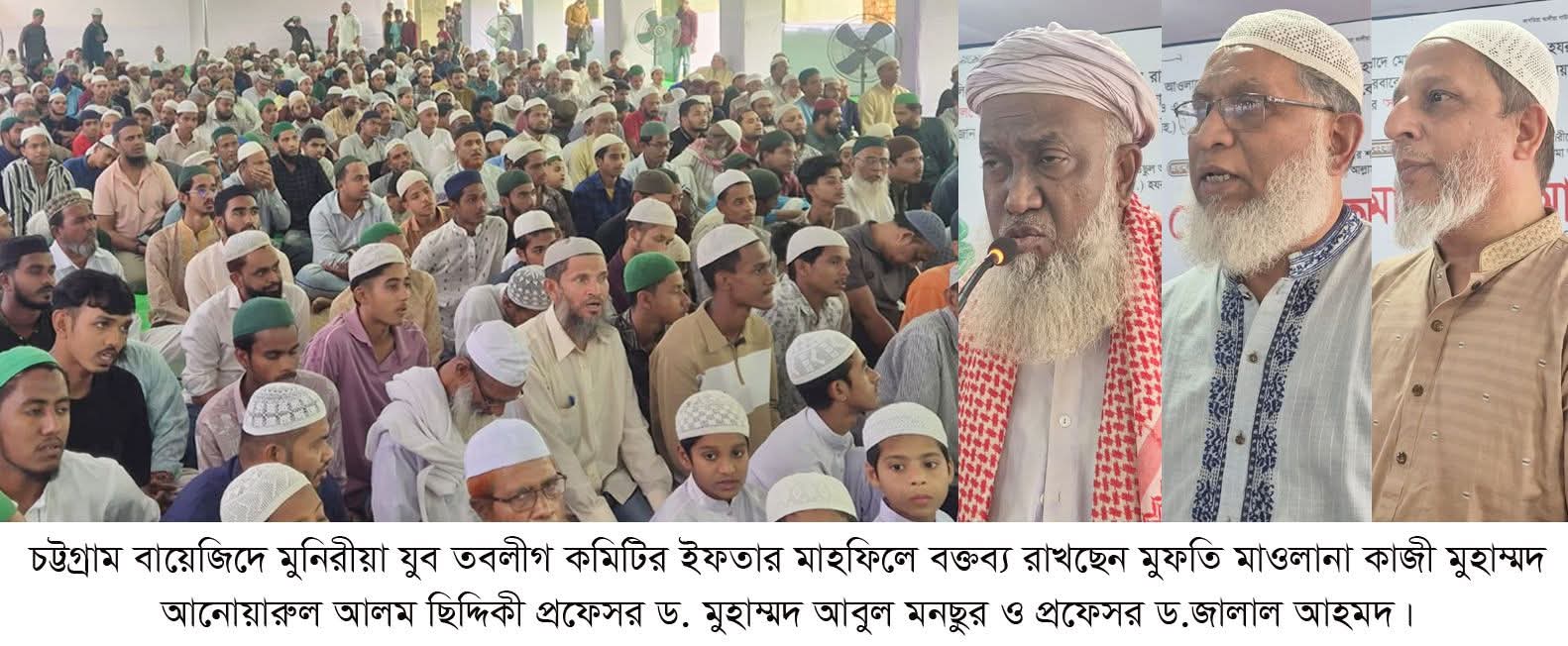 চট্টগ্রাম বিশ্ববিদ্যালয়ের সিনেট সদস্য ও মুনিরীয়া যুব তবলিগ কমিটি বাংলাদেশ এর মহাসচিব প্রফেসর ড. মুহাম্মদ আবুল মনছুরের সভাপতিত্বে অনুষ্ঠিত ইফতার মাহফিলে বক্তব্য রাখেন মুফতি মাওলানা কাজী মুহাম্মদ আনোয়ারুল আলম ছিদ্দিকী, প্রফেসর ড.জালাল আহমদ, মাওলানা মুহাম্মদ শফিউল আলম ও মাওলানা মুহাম্মদ জসিম উদ্দিন ।