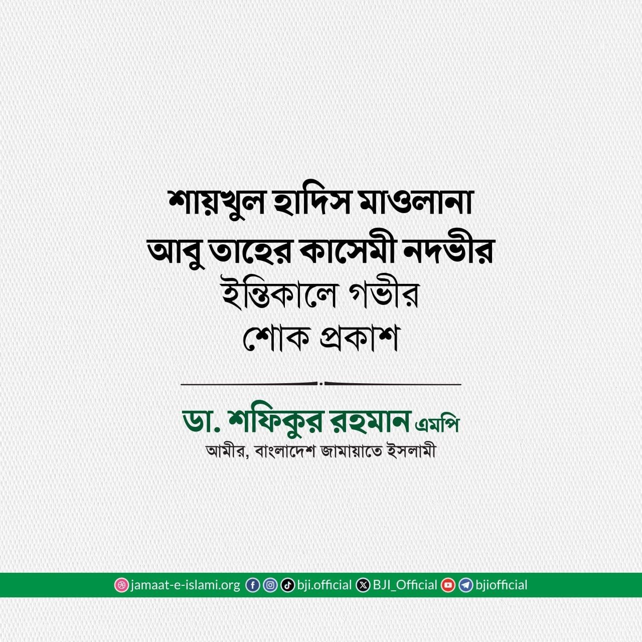 জামিয়া ইসলামিয়া চট্টগ্রাম পটিয়ার মুহতামিম ও শায়খুল হাদিস মাওলানা আবু তাহের কাসেমী নদভীর ইন্তিকালে গভীর শোক প্রকাশ করে মাননীয় বিরোধীদলীয় নেতা, আমীরে জামায়াত ডা. শফিকুর রহমান ৩০ মার্চ এক শোকবাণী প্রদান করেছেন।
