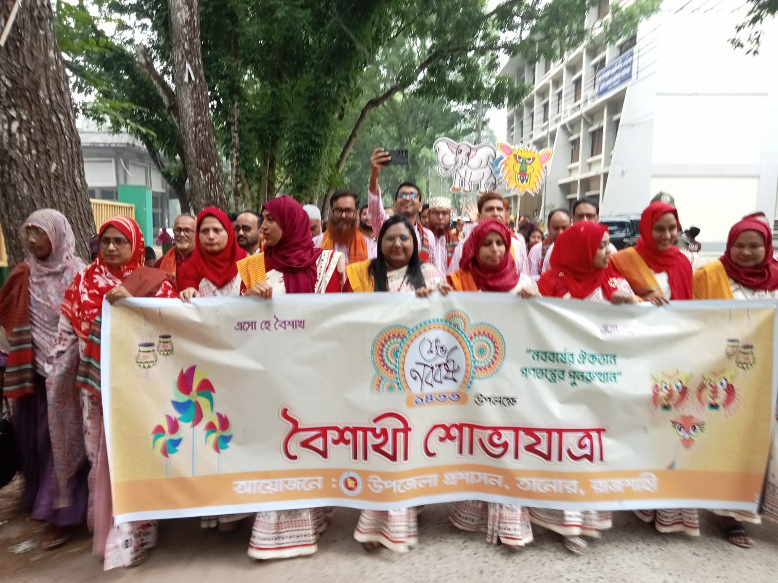 সকালে যথা সময়ে তানোর উপজেলা প্রশাসনের উদ্যোগে রঙ্গিন ঐতিহ্যবাহী শুভযাত্রা বের করা হয়। শোভাযাত্রায় তানোর উপজেলা নির্বাহী অফিসার জনাব নাইমা খানসহ সকল উপজেলা কর্মকর্তাগণ অংশগ্রহণ করেন। শোভাযাত্রা শেষে পান্তা ভাত, মাছ ভর্তা, কাঁচা মরিচ ইত্যাদি পরিবেশন করা হয়। পান্তা খাওয়া শেষে উপজেলা চত্বরের মঞ্চে জাতীয় সংগীত পরিবেশন এবং রবীন্দ্রনাথ ঠাকুরের কালজয়ী গান ‘এসো হে বৈশাখ’ গাওয়ার মধ্য দিয়ে দিবসের আনুষ্ঠানিকতার সূচনা করা হয়। অনুষ্ঠানে প্রধান অতিথি হিসেবে উপস্থিত ছিলেন উপজেলা নির্বাহী অফিসার জনাব নাইমা খান। তিনি সংক্ষিপ্ত বক্তব্যে বলেন, বাংলা নববর্ষ বাঙালির অসাম্প্রদায়িক চেতনা, ঐক্য ও সংস্কৃতির প্রতীক—যা নতুন প্রজন্মের কাছে তুলে ধরতে এমন আয়োজন অত্যন্ত গুরুত্বপূর্ণ।