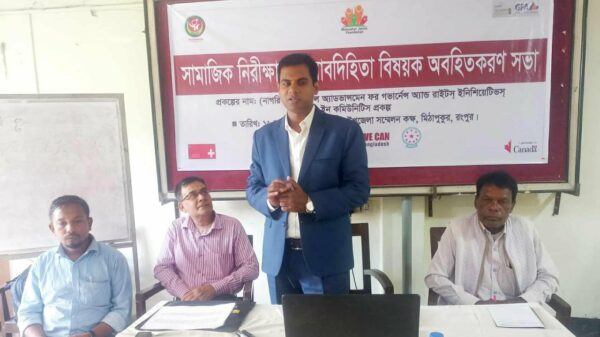 মিঠাপুকুরে সামাজিক নিরীক্ষা ও জবাবদিহিতা বিষয়ক অবহিতকরণ সভা অনলাইন তালাশ ক্রাইম রিপোর্টার রাসেল আহমেদ। মিঠাপুকুর জিএফএ কনসালটিং গ্রুপ,কানাডা ও সুইজারল্যান্ড সরকারের আর্থিক সহায়তায় এবং জাতীয় বেসরকারি সংস্থা আমরাই