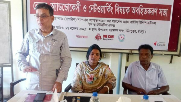 মিঠাপুকুরে নেতৃত্ব অ্যাডভোকেসি ও নেটওয়ার্কিং বিষয়ক অবহিতকরণ সভা। অনলাইন তালাশ ক্রাইম রিপোর্টার রাসেল আহমেদ। মিঠাপুকুর রংপুর জিএফএ কনসালটিং গ্রুপ,কানাডা ও সুইজারল্যান্ড সরকারের আর্থিক সহায়তায় এবং জাতীয় বেসরকারি সংস্থা আমরাই পারি