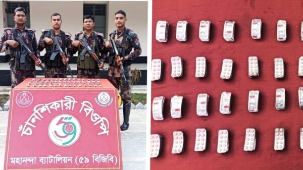 ভোলাহাট সীমান্তে ৫৯ বিজিবির অভিযানে ৩১৯০ পিস ভারতীয় নেশাজাতীয় ট্যাবলেট জব্দ মাহিদুল ইসলাম ফরহাদ চাঁপাইনবাবগঞ্জ জেলা প্রতিনিধি চাঁপাইনবাবগঞ্জ ভোলাহাট সীমান্তে (২৩ নভেম্বর) মধ্যরাত ০১:২০ ঘটিকায় মহানন্দা ব্যাটালিয়ন (৫৯ বিজিবি) এর